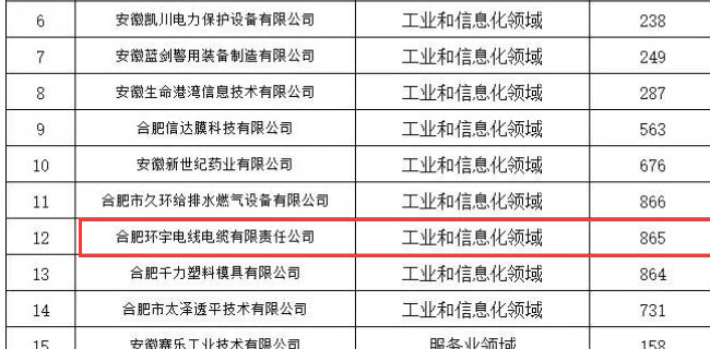 近日,安徽省經(jīng)濟和信息化廳發(fā)布了 2023年安徽省“專精特新”企業(yè)名單,合肥環(huán)宇電線電纜成功入選,認(rèn)證編號865.